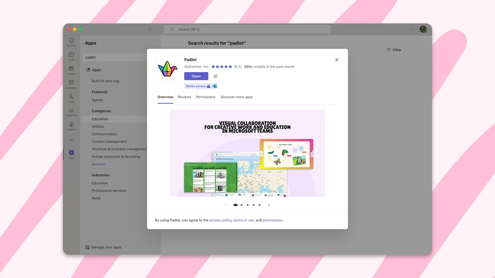 Teams 앱 스토어에서 "Padlet"을 검색하면 바로 나옵니다. 아직 Padlet 사용자가 아니라면 padlet.com에서 무료로 가입할 수 있으며, 학생들은 선생님이 테크에 매우 능숙하다고 생각하게 될 겁니다.